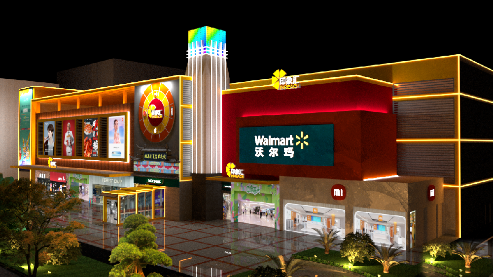 在具体方案中,设计团队采用 "分层布光、主次呼应" 的策略:建筑主立面以 3000K 暖白光洗墙灯为基础,通过精准的光束角控制,勾勒出简洁大气的建筑轮廓,既凸显了现代商业建筑的利落线条,又与沃尔玛超市的温馨消费氛围相适配;裙楼部分则创新采用暗藏式 LED 线条灯,沿商铺招牌的边缘有序排布,在夜间形成连贯的光影灯带,既保证了商铺标识的清晰呈现,又避免了强光对行人的视觉干扰。这种设计既尊重了建筑原有结构,又通过灯光层次的变化,让建筑在夜色中呈现出 "远观有轮廓,近赏有细节" 的视觉效果。