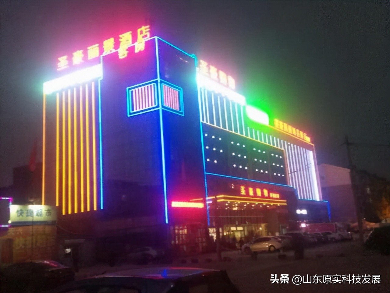 滨州圣豪丽景商务酒店楼顶铝板冲孔发光字与铝板冲孔灯条