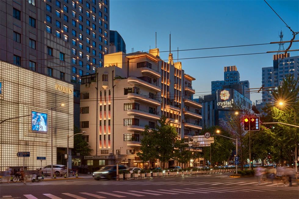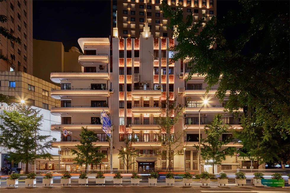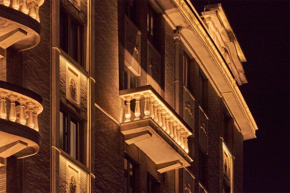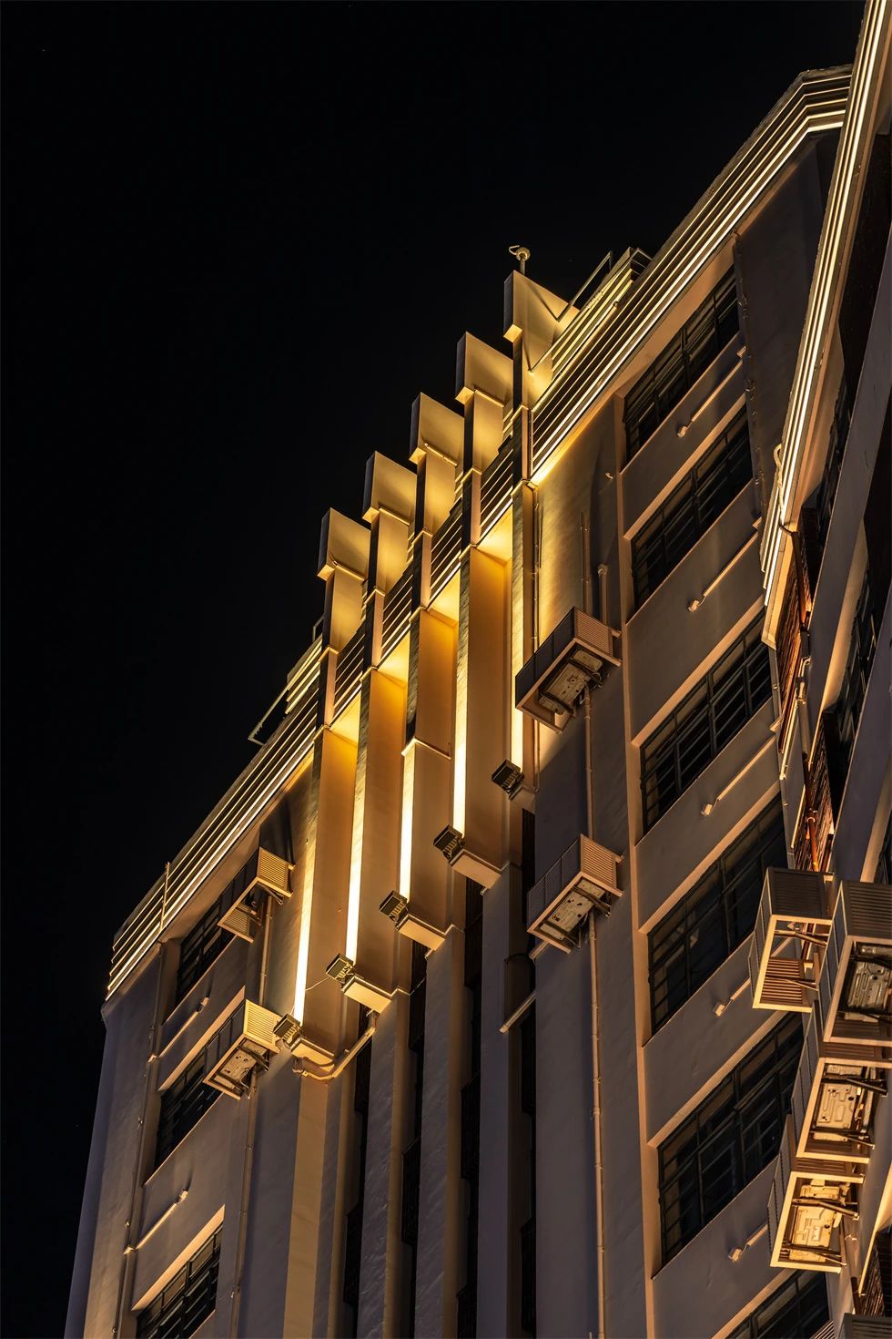 常德公寓为1936年竣工的装饰艺术派风格建筑,夜景重点表现其东立面,层层向上的灯光富有节奏地烘托中部竖向线条,柔和升起的水平线性灯光优雅细腻地展现弧形伸展的阳台,配合摇曳发光的装饰灯,典雅低调,令人驻足。