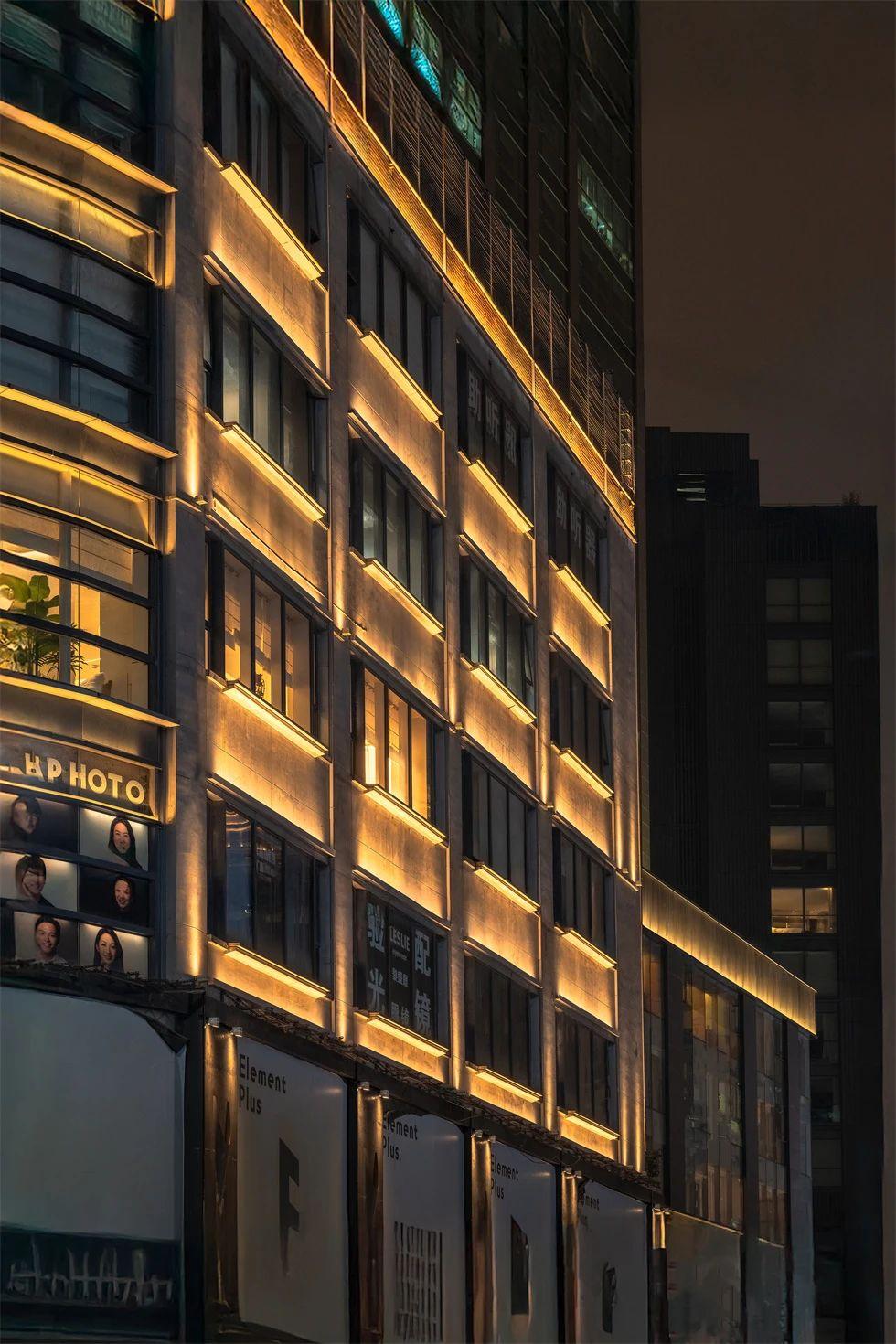 视线随着光的引导向两侧延伸,刻画出建筑的天际线。立面通过纵向灯光表现建筑的挺拔感,总体灯光表达出建筑精致典雅的三段式结构。
