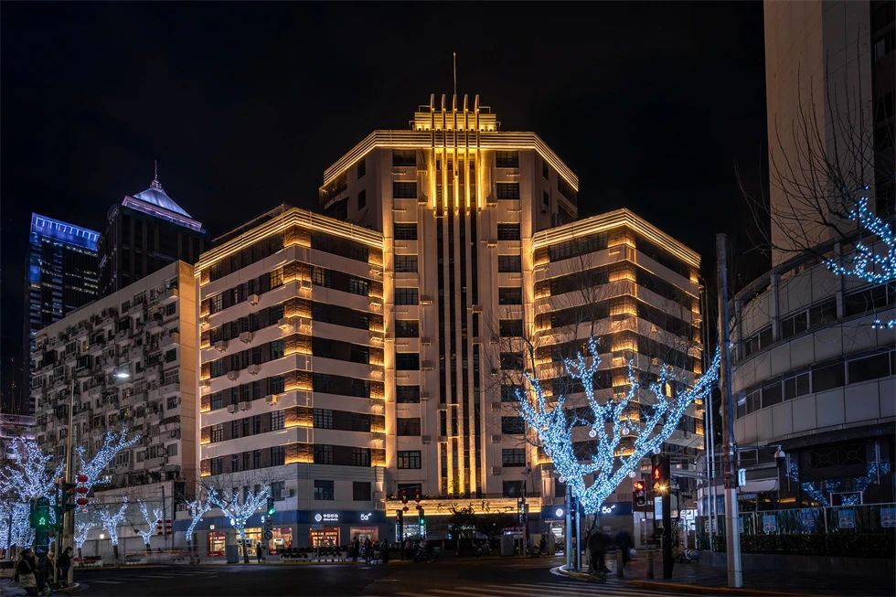 泰兴大楼为1934年建现代派风格建筑,立面中高两低对称造型,中间主体后退形成主入口前场。总体夜景灯光以稳定匀称的形式体现建筑的体量关系,中部纵向灯光展现竖线条构图,两侧体块感灯光展现两翼横线条构图,展现建筑匀称的力量感。